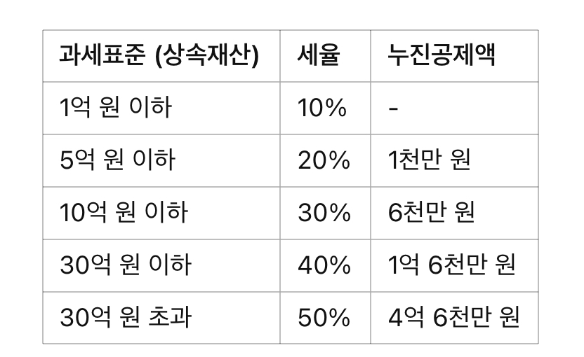 상속세는 다음과 같은 누진세율이 적용됩니다.