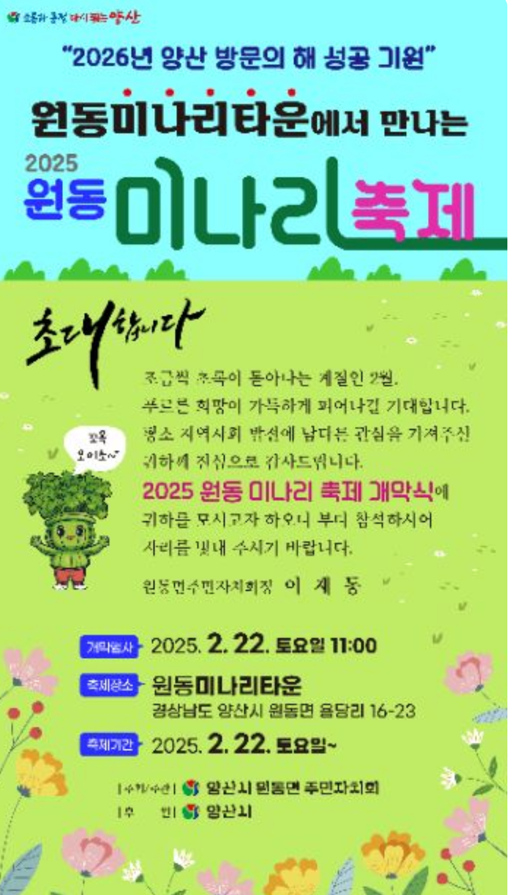 - 축제 개막식 : 2025년 2월 22일 토요일 11:00 (미나리타운 행사장)