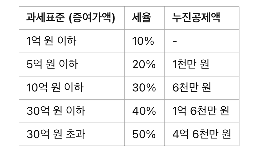 증여세는 다음과 같은 누진세율이 적용됩니다.